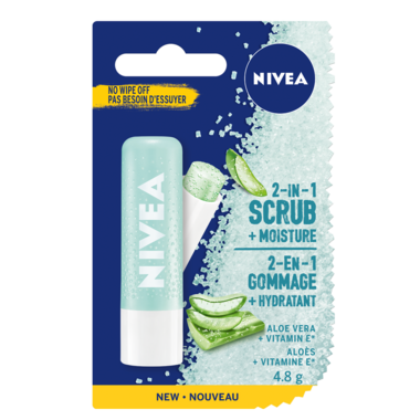 Keep your lips feeling super soft and hydrated with Nivea 2-in-1 aloe vera scrub + moisture. This exfoliating lip balm formula is enriched with vitamin E and organic aloe vera to help with chapped lips.