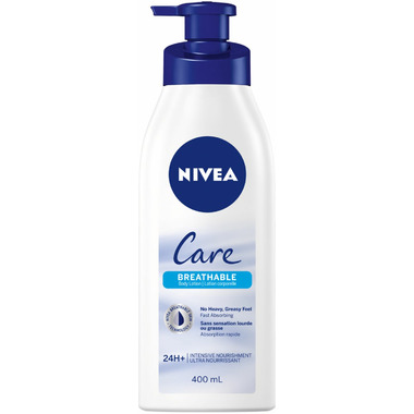 NIVEA Care Breathable Body Lotion Lightweight Formula with Heavy Duty Moisture. Give your skin 24-hour intensive moisture without any greasy, heavy feel. Introducing NIVEA Care Breathable Body Lotion, Niveas revolutionary lightweight formula that uses breathable technology to quickly absorb and keep your skin feeling natural. That's right, this paraben free body lotion melts into your skin without any sticky feeling. This body moisturizer with plant-derived ingredients and no dye, its powered by a vitamin enriched formula to give your skin exactly what it needs.
