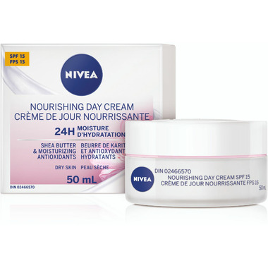 NIVEA Essentials 24H Moisture Boost + Nourish Day Cream with SPF for Dry Skin - NOURISH YOUR DRY SKIN Essentials 24H Moisture Boost + Nourish Day Cream with SPF 15 is a lightweight, non-greasy cream that has been specially formulated to hydrate and deeply nourish skin during the day. Enriched with Shea Butter & moisturizing antioxidants, it delivers fast-absorbing moisture and long-lasting hydration for plump-looking, smooth skin. The moisturizing formula contains SPF 15 to help protect the skin from sunburn and sun damage during the day. The moisturizer also helps protect your skin from environmental stressors that may cause dryness and soothes dry skin all day long for long-lasting smoother skin