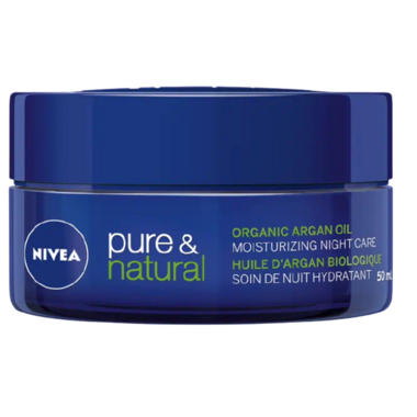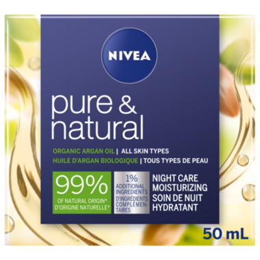 Overnight skincare powered by nature. NIVEA Pure & Natural Moisturizing Organic Argan Oil Night Care is an easy way to nourish your face while you sleep. Suitable for all skin types, this hydrating argan oil cream is formulated with jojoba and almond oils for effective overnight care. You'll wake up to smooth, supple, and rested looking skin - and its made with 99% natural origin ingredients.
