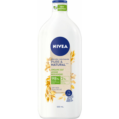 NIVEA Pure & Natural Body Lotion for dry skin to very dry skin is made with 98% natural origin ingredients* and 100% organic oat. These natural body lotion formula effectively hydrates for smooth, moisturized, and healthy-looking skin for 48 hours and you can squeeze out every last drop of this NIVEA lotion thanks to our unique roll up packaging, which contains 50% less plastic**. This oat lotion also contains no parabens, silicones, mineral oils or microplastics.