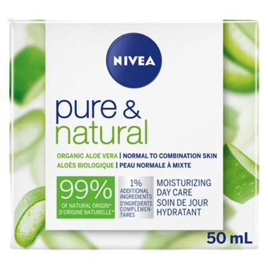 NIVEA Pure & Natural Moisturizing Day Care effectively hydrates normal to combination skin while improving its complexion and texture. Helps the skin to feel instantly hydrated, naturally soft and feeling moisturized all day long.