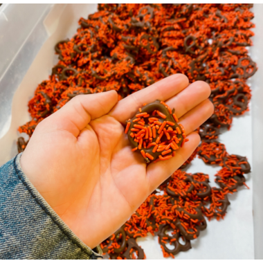 Trick-or-treat! Give me something safe and sweet! Enjoy individually wrapped chocolatey covered pretzels covered in bright orange sprinkles, representing the shape of a jack-o-lantern! This product is made in a dedicated facility free from the top 9 common allergens.