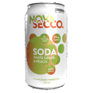 Novasecco White Grape & Peach Prebiotic Soda. Crisp white grapes pair with soft peach to create a sparkling, fruity experience.