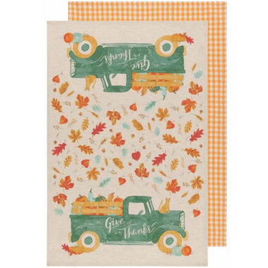 Celebrate the bountiful harvest of the season with this set of Autumn Harvest Printed Towels by Now Designs. The truckload of farm produce with an inspiring Give Thanks message and showers of bright autumn leaves add a fall feeling to your kitchen.