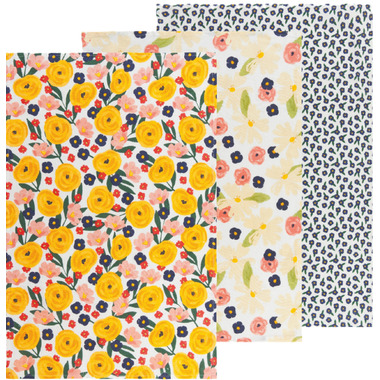 Extra soft and uniquely textured this Bakers floursacks set evokes nostalgic memories of grandma's favorite kitchen linens. Made from superior quality cotton, this set includes three charming prints with joyfully rendered daisies, peonies and other garden favorites that are sure to become treasured classics in the kitchen. Fresh floral flowers thrive in a contemporary color palette of dusk blue, marigold, and coral in this set from the Full Bloom collection.