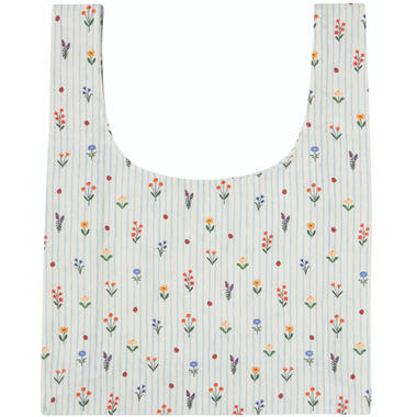 Soft, slow, picnic-perfect summer days inspire this bright and airy Hand Picked Grocery bag. Made of cotton this reusable bag is mightier than it appears. A large, flat base supports cans, produce, or take-out containers while wide handles make carrying more comfortable. Reminiscent of the classic plastic grocery bag we all know well - just more stylish, durable, and endlessly reusable. Part of the Hand Picked collection, this design offers painted daisies and ladybugs on a striped light blue and comforting cream surface.