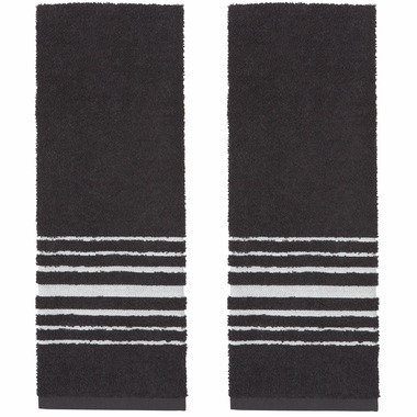 Add the classic, sleek look of black and white to any towel bar with this set of two Black Hang-up Towels. With Now Designs Hang-up Towels in the home, a soft and absorbent hand towel is always within reach. This towel features an innovative design with four rust-resistant magnets that secure it over a towel bar or oven handle. Forget about finding your favorite hand towel on the floorthe magnetic snaps ensure that it won't slip, so it's no match for rambunctious kids or furry friends. Dry your hands on the go without ever worrying about refolding your hand towel. The top half of this hang-up towel comes folded and sewn, so that the towel retains its shape. Crafted of 100% looped cotton terry with white accent stripes woven into the front, this hand towel is supremely soft while delivering the absorbency you need to dry your hands effectively. Caring for your hang-up towel is simpleחjust a quick toss in the washing machine on warm and tumble dry on low. Thanks to its durable design and easy care, this hanging hand towel is a reliable option for hand drying that you can enjoy for years to come. This Now Designs magnetic hang-up towel delivers everyday practicality and lasting durability, making it a staple you can count on in your home.
