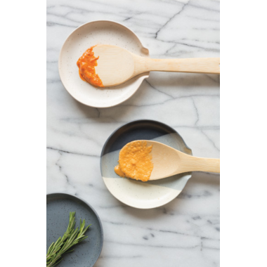 Circular spoon rests with speckled surfaces add modernity to the kitchen. Using a reactive glaze technique, each piece is unique.