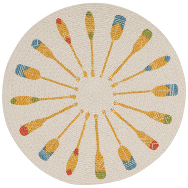 Cotton threads twist and tie into circular braided placemats. A sturdy construction is completed with fun prints or metallic sparkle.