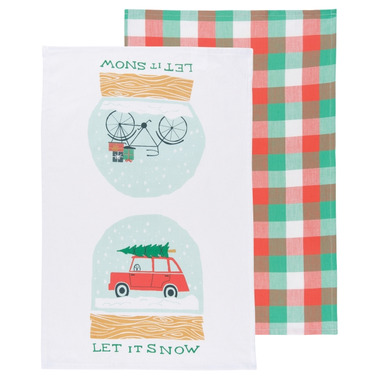 Snow globes enclose presents piled on a bike and evergreen atop a station wagon paired with a charming and classic check print. Add this vintage Holiday vision to your kitchen this season and reminisce about family traditions.