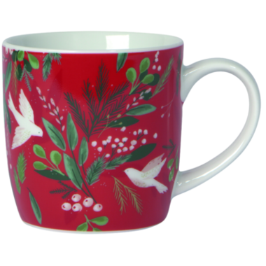 Doves flutter amongst boughs of winter greenery and berries. Sprigs of pine, cedar and eucalyptus sweep against a crimson red background.