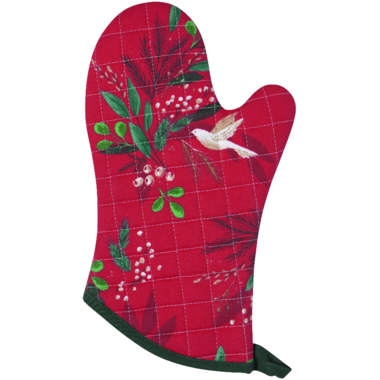 Doves flutter amongst boughs of winter greenery and berries. Sprigs of pine, cedar and eucalyptus sweep against a crimson red background.