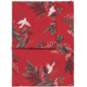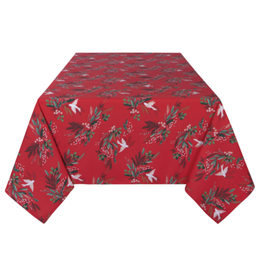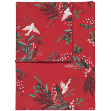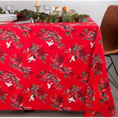 Doves flutter amongst boughs of winter greenery and berries. Sprigs of pine, cedar and eucalyptus sweep against a crimson red background.