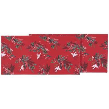 Doves flutter amongst boughs of winter greenery and berries. Sprigs of pine, cedar and eucalyptus sweep against a crimson red background.