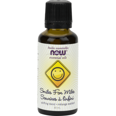 NOW Essential Oil Smiles for Miles Blend is uplifting, energizing and refreshing.  A mild citrus blend with warm spice notes that will be sure to lift your spirits and refresh your mind.