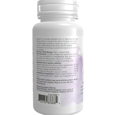 Ingredients (each capsule contains): Hyabest Hyaluronic Acid (from sodium hyaluronate) 60 mg* Hyaluronic Acid (from sodium hyaluronate) 60 mg*, Hydrolyzed Collagen (from Fish Skin) 100 mg *Total Hyaluronic Acid per 1 capsule serving 120 mg. Non-Medicinal Ingredients: Capsule (hypromellose, water), Microcrystalline Cellulose, Stearic acid (vegetable source), Silica.