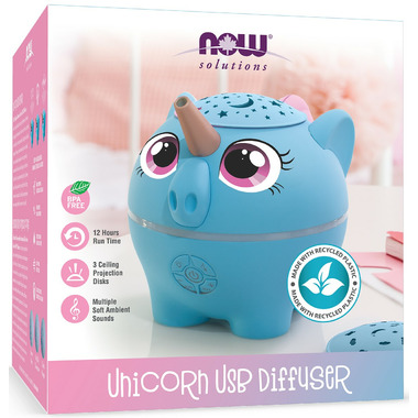 NOW Solutions Ultrasonic Unicorn USB Oil Diffuser is made of recycled plastic and uses high frequency ultrasonic technology that vibrates water inside the unit into an ultra-fine mist which helps to maintain essential oil integrity and holistic properties. When your favourite essential oils are added, they are immediately dispersed into the air, providing immediate healthful benefits while helping to ionize the air. The addition of the projection templates (night sky, flowers, clouds & kites) coupled with music sounds (birds chirping, river water, forest sounds & soft winds) creates a relaxing, healthful environment for any child.