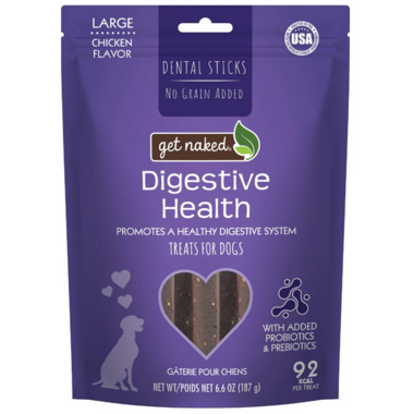 Specially formulated with a grain-free blend of dietary fiber, prebiotics, and probiotics, Get Naked Digestive Health Grain Free Dental Chew Sticks, Small 6.2oz help maintain a healthy digestive system. Added Ganeden BC30, a patented strain of Bacillus coagulans, helps improve the total number of beneficial microflora in the digestive system. Your dog will gain the stomach-empowering benefits of Get Naked Digestive Health chew sticks, while enjoying the delicious chicken flavor.