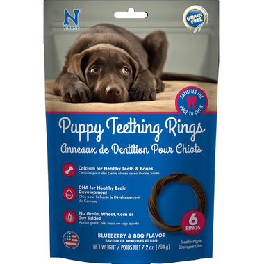 Growing new teeth is tough work! Sore gums and a strong urge to chew while cutting new teeth can turn your precious puppy into a whirlwind of destruction. N-Bone Puppy Teething Rings are easy for floppy puppy paws to hold onto and provide a soothing and appropriate outlet for chewing. Formulated with DHA and calcium to support your puppy's unique nutritional needs, our delicious chicken flavored rings are pliable and won't damage immature teeth. Try N-Bone Puppy Teething rings today!