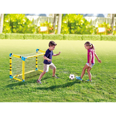 Three great games all in one easy to assemble set! Includes Soccer/Hockey Goal (35in x 24in x 17in) that transforms to Tennis Net. 6in PVC Soccer Ball 2 Light Weight Tennis Rackets, Tennis Bal,l 2 Hockey Sticks, Hockey Ball, Hockey Puck, Inflation Pump with Needle. Rotating net corner pieces swing around 90 degrees to easily convert the Soccer/Hockey net into a longer width tennis net Ages 3+.