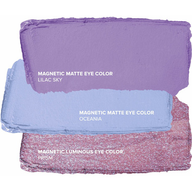 The DREAMY EYES kit contains award-winning: MAGNETIC MATTE EYE COLOR; Lilac Sky (matte violet), Oceania (matte marine blue), and MAGNETIC LUMINOUS EYE COLOR; Prism (rose with purple-blue highlight).