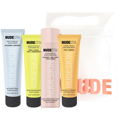 What it is: The NUDESKIN 4-Step Citrus Renew Set Gentle is a collection of full size NUDESKIN essentials to cleanse, tone, exfoliate and hydrate the skin with simple, multi-tasking, vegan powered skincare for a boost of fresh beauty. Created for all skin types including sensitive skin, and packaged in a perfectly portable clear carrying case, this set is just what you need to get glowing skin.