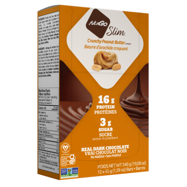 Like a spoonful of peanut butter straight from the jar - without the mess. Enjoy the flavours of sweet, creamy peanut butter and indulgent real dark chocolate in a take-it-anywhere bar that is vegan and gluten-free. With just 3g of sugar and 16g vegan protein, NuGo Slim Crunchy Peanut Butter is a must-have for all peanut butter lovers. As always, NuGo Slimή contains no Maltitol or artificial sweeteners.