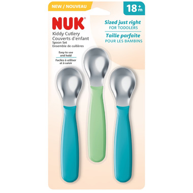 NUK Kiddy Cutlery Spoons are the ideal size and shape for your toddler's little mouth and hands. The durable stainless steel tips safely pick up all your little one's favorite foods. The easy-grip handles are designed to keep utensil tips off the table and away from germs. Plus, spoons are dishwasher-safe and BPA-free for total peace of mind.