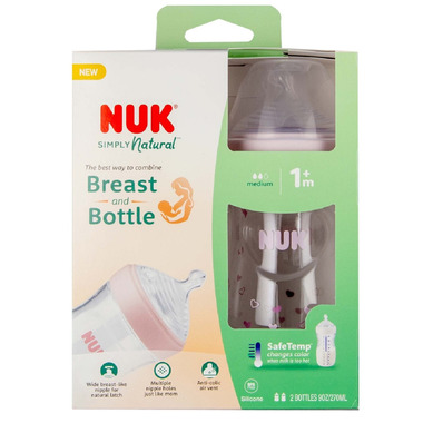 Now your baby can transition from breast to bottle in a natural way with the NUK Simply Natural Bottles. Designed to mimic the fit, flow, and movement of mom as closely as possible, this is the only bottle with up to 9 nipple holes, just like mom. This provides a natural feeding experience to ensure the mom-baby bond remains strong. NUK Simply Natural bottles feature a super-soft nipple that mimics the shape of mom's breast while breastfeeding. The scoop nipple cavity allows space for baby's tongue and jaw to move naturally, just like they do when breastfeeding. Now NUK Simply Natural bottles feature SafeTemp technology, which lets you know when milk is too hot. The blue thermometer indicator fades when milk is too hot and reappears when milk has cooled and is safe to drink.
