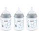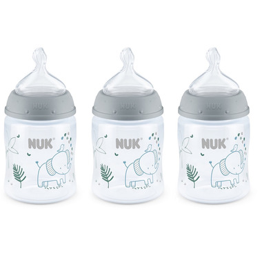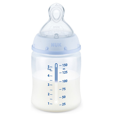 NUK Smooth Flow Bottles are the anti-colic solution for bottle feeding, featuring a unique nipple design that allows baby to control the flow rate for colic-free feeding. This Smooth Flow nipple adjusts the flow based on how your baby drinks, adapting to their suction strength to ensure they will always have the right flow rate. The SafeTemp temperature indicator lets you know when milk is too hot with just a glance. The blue thermometer indicator fades when milk is too hot and reappears when milk has cooled and is safe to drink.