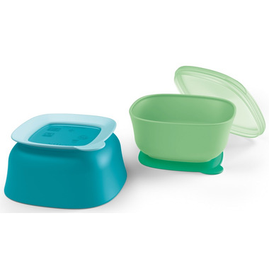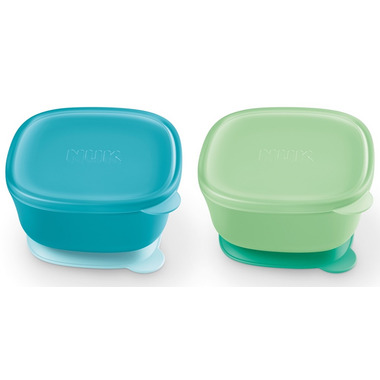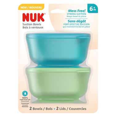 Mealtime can be messy with babies who are just starting to feed themselves. NUK suction bowls are designed to prevent accidental tipping and minimize the temptation to toss bowls onto the floor. The strong suction base sticks to most flat surfaces, and the quick-release tab makes removal easy for parents. Bowls feature high walls that help baby get more food onto their spoons, as they scoop against the sides. NUK suction bowls also come with leak-proof lids, great for travel or daycare and post-mealtime storage in the refrigerator. Microwave-safe for warming up meals and top rack dishwasher-safe for fast, parent-friendly cleanup. Plus, bowls and lids are BPA-free for total peace of mind.