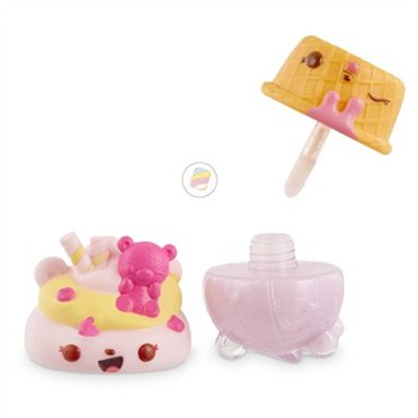 Sparkly and scented liquid lip gloss with wand applicator. Scented Num (outer) in a variety of flavors acts as interchangeable sundae topping. Scented Nom (inner) is transparent cup containing lip gloss Mystery Packs shaped like cute ice cream scoops Collector’s menu, Collect them all!
