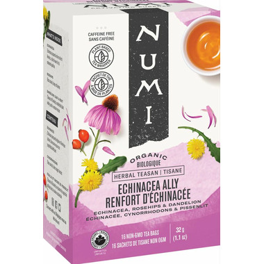 Organic herbal teasan echinacea ally tea with echinacea, rosehips and dandelion. This tea is caffeine free and has plant based tea wrappers.