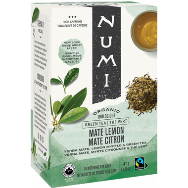 Numi Organic Mate Lemon – yerba mate, lemon myrtle and green tea.