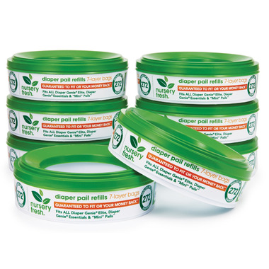 These Nursery Fresh diaper pail refills are GUARANTEED TO FIT all Diaper Genie II Elite and Diaper Genie II pails, and guaranteed to fit all Diaper Genie Essentials and Diaper Genie Elite pails purchased prior to March 1, 2014. The refill bags are made with 7-layer film and offer the ultimate in odor protection. This 8pk refill can hold up to 2,176 newborn diapers.
