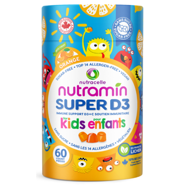 Canadian-Owned Female-Founded. Made with Love on Prince Edward Island. Give your childs immune system a natural boost with Nutramin Super D3 Kids Gummies the first Canadian-made, plant-based D3 sourced from wild-harvested lichen. Each gummy delivers clean, powerful nutrition made with premium vegan ingredients and 100% real fruit pectin from apples. Created by a mom and backed by science and love, Nutramin Super D3 is designed to be safe, effective, and fun so parents can trust every dose and kids look forward to it every day. What Makes Super D3 So Super. Plant-Based D3 + C Support ח Sourced from lichen for optimal absorption and immune defense. Top 14 Allergen-Free & Certified School Safe Absolutely no gluten, peanuts, soy, dairy, or tree nuts. Zero Sugar & No Artificial Additives ח Naturally sweetened with monk fruit for a clean, guilt-free treat. Made with Real Fruit Pectin Gentle on little tummies and bursting with fresh orange flavour. Vegan ו Halal Kosher Certified. Crafted to meet every familys needs