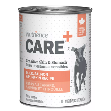 Perfect complement to Nutrience Care Sensitive Skin & Stomach dry dog food Wet food helps increase water intake Rich in Omega-3 - Includes coconut oil and salmon oil, rich in omega-3, to help maintain a healthy skin & coat Rich in Fiber - Made with fresh pumpkin, a source of prebiotic fibers Duck, Salmon & Pumpkin recipe Size: 369 g (13 oz)