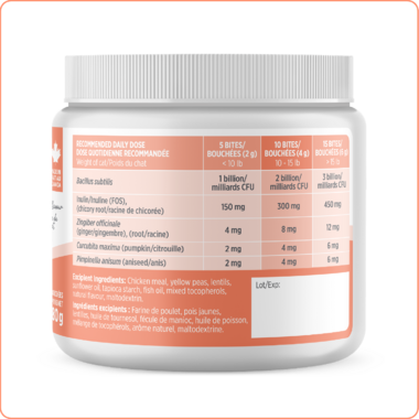 Nutrience Care Probiotic+ Cat Supplement is specifically designed to support digestion, gut health, and immune function in cats. This premium supplement contains a powerful blend of probiotics and prebiotics that work synergistically to promote the growth of beneficial gut bacteria and maintain a balanced gut microbiome, essential for your cat's overall health. These delicious supplements are loved by even the pickiest cats. Fiberrich ingredients such as pumpkin and chicory root enhance digestive support by encouraging regular bowel movements and promoting healthy digestion. Pumpkin is widely recognized for its ability to soothe upset stomachs and prevent diarrhea, while chicory root acts as a natural prebiotic, nourishing beneficial gut bacteria. Additionally, the formula includes ginger, which aids gastrointestinal motility for efficient digestion, and aniseed, renowned for relieving gas, indigestion, and constipation. By fostering a diverse gut flora, this supplement helps maintain optimal intestinal balance, reducing the risk of digestive issues. The combination of probiotics, prebiotics, and fiber ensures efficient digestion, allowing your cat to better absorb and utilize vital nutrients.