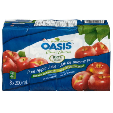 Oasis Pure Apple Juice Boxes are an excellent choice for you and your family! This Pure Apple Juice is not from concentrate and no sugar is added.