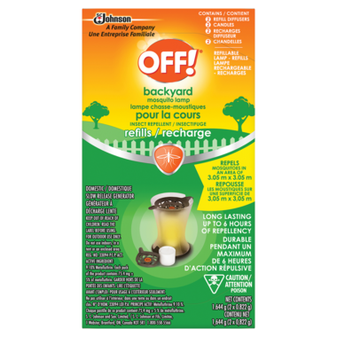 This OFF product works great. We live on a rural property with lots of mosquitos. 2 lanterns on our patio deck does a good job of keeping the mosquitos away.