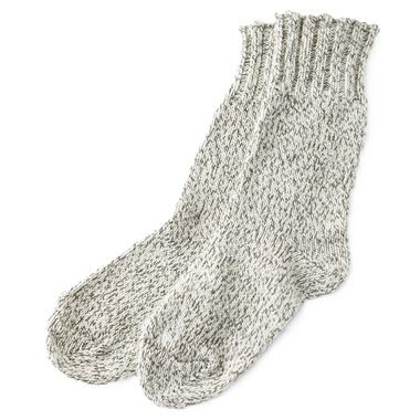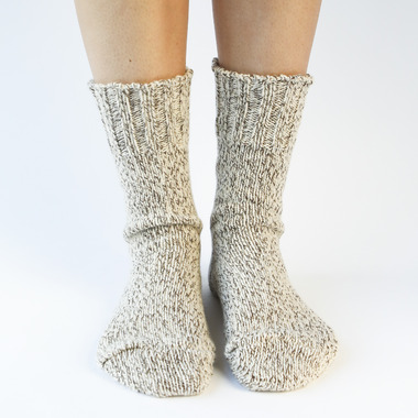 Cozy and durable 100% wool socks that sit 10 high from the ankle. Wear them with your boots or around the house or cabin. Made in Canada. Thick gauge, heritage quality. Birch is a blend of woolen yarns in cream, beige and brown.