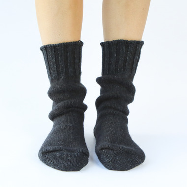 Cozy and durable 100% wool socks that sit 10 high from the ankle. Wear them with your boots or around the house or cabin. Made in Canada. Thick gauge, heritage quality. Midnight is a blend of woolen yarns in black, navy blue, and dark green.