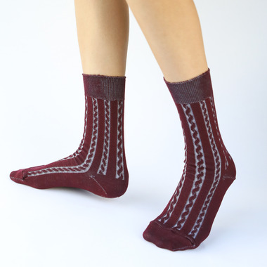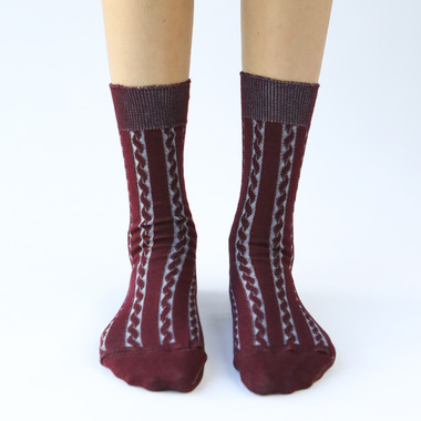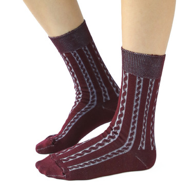 Cable knit dress socks make a subtle entrance, whether dressing for work or slay. Made in neutral and off-beat colours, the socks are knit with contrasting yarns to amplify their cable knit texture. Rococo is created with a combination of deep burgundy and powder blue.