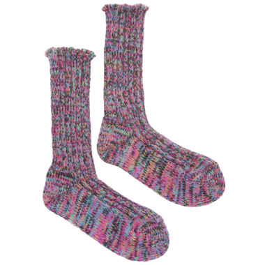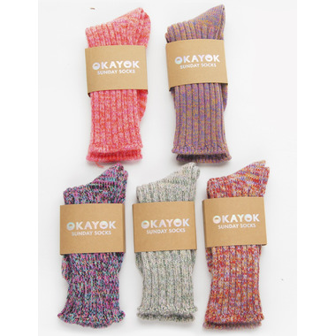 Okayok cozy Sunday Socks have a thick gauge, and are made for lounging around the house or cabin, or for wearing inside your winter boots. They're knit with mixed fibres and yarns in four colours. When the yarns twist in the machine, you get off-beat variations in the pattern of each sock. Sunday Socks have a cozy and colourful personality - a fun gift to give and receive. Sunday socks have been redesigned for Fall 2023 - their rib knit design gives them a closer fit to the foot and ankle. They're made at a small factory in Brampton, Ontario. CMYK is made up of yarns in Bright Blue, Neon Pink, Yellow and Black.