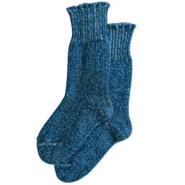 Okayok cozy Sunday Socks have a thick gauge, and are made for lounging around the house or cabin, or for wearing inside your winter boots. They're knit with mixed fibres and yarns in four colours. When the yarns twist in the machine, you get off-beat variations in the pattern of each sock. Sunday Socks have a cozy and colourful personality - a fun gift to give and receive. Sunday socks have been redesigned - their rib knit design gives them a closer fit to the foot and ankle. They're made at a small factory in Brampton, Ontario.