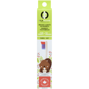 The OLA Bamboo toothbrushes are the only one made in Canada. Recommended for children from 5 years of age to use the toothbrush. Avoid using if children bite the toothbrush. The shape of the bristle has an upward curve to better reach molars. The handle of the toothbrush is 100% compostable and biodegradable. It is made of bamboo. The bristles of the OLA Bamboo toothbrush are made of high-quality nylon for better brushing.