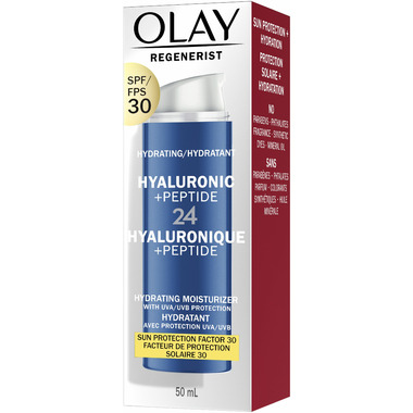 Supercharge your hydration for radiant skin with Olays Hyaluronic + Peptide 24 formulas. Olay Regenerist Hyaluronic + Peptide 24 Face Moisturizer + SPF 30 gives you long-lasting hydration plus SPF 30 UVA/UVB sun protection. This clean, lightweight, fragrance-free formula feels smooth to apply and absorbs quickly without leaving skin feeling greasy. Olay Regenerist Hyaluronic + Peptide 24 SPF 30 is made with powerful ingredients including Niacinamide and Peptides. To use, apply and reapply as needed. On day 1, you will feel instant hydration that lasts 24 hours. With two weeks of use, you'll notice softer, smoother skin. With 1 month of use, you will see radiant skin that glows. Olay Regenerist Hyaluronic + Peptide 24 Face Moisturizer + SPF 30 is made with dermatologist-recommended SPF, and this clean formula is made without synthetic dyes, fragrances, parabens, mineral oil, or phthalates. Whats not to love about long-lasting hydration + sun protection?