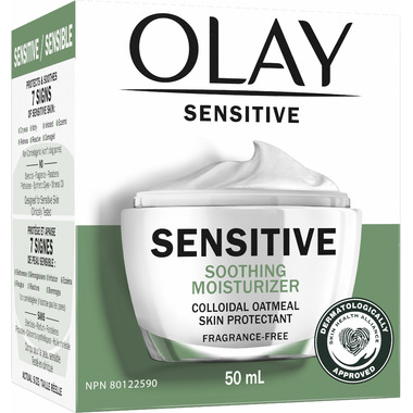Its time to show sensitive and irritated skin a little extra TLC with OLAY Sensitive Soothing Moisturizer, a fast-acting formula that provides instant and long lasting hydration and temporary itch relief. What makes this face moisturizer so great for sensitive skin? It contains key ingredients like colloidal oatmeal to soothe symptoms from rashes, eczema, poison ivy, oak, or sumac plus vitamin B3, and shea butter to hydrate. Plus, it's non-comedogenic and free of steroids, fragrance, parabens, phthalates, dyes, and mineral oil.Our sensitive face moisturizer absorbs quickly and provides protection against seven signs of sensitive skin: Dryness Redness Itchy Reactive Irritated Damaged Eczema