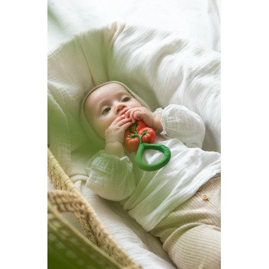 New revolutionary concept! Oli & Carol's Tomato Teething Rattle Toy is the GREENEST RATTLE IN THE MARKET! Its exterior is made of 100% natural rubber, and inside are upcycled cherry seeds that turn this teether into a rattle. 2 in 1! This rattle toy has been designed hand-to-hand with certified otorhinolaryngologists, with whom we have been able to create the perfect sound pitch that will help babies calm down, rather than overstimulate them!
